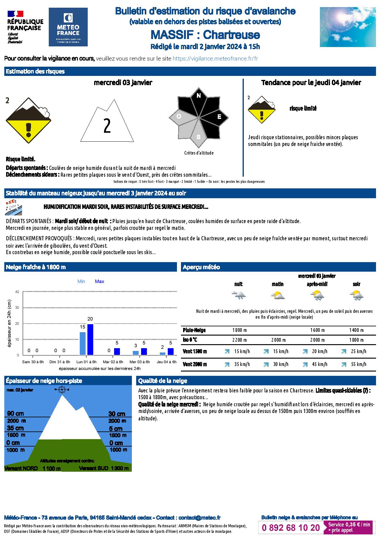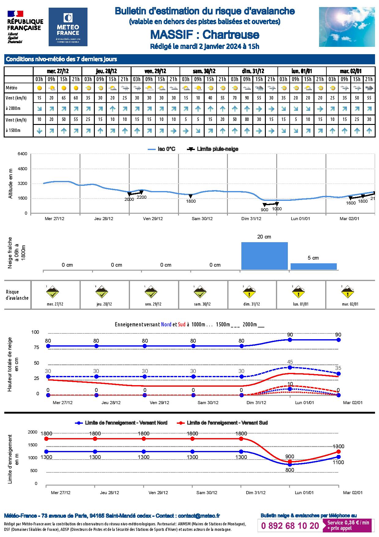 • un bulletin décrivant pour chaque massif la stabilité du manteau neigeux, les conditions d'enneigement (épaisseurs de neige, qualité de la neige de surface, chutes de neige récentes…), les prévisions météorologiques ;