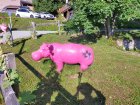 Après une petite grimpette dans la station pour nous mettre en jambes, la montée se poursuit calmement dans les arbres sous un télésiège. Certes nous aurons pu l’emprunter, mais était-ce le but de la journée ? Au coin d’un chalet nous voyons un hippopotame rose, alors que nous n’avions bu que de l’eau !! L’air de la montagne semble bien enivrant ce matin !